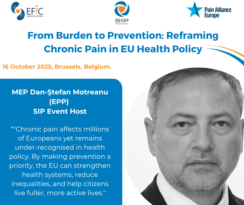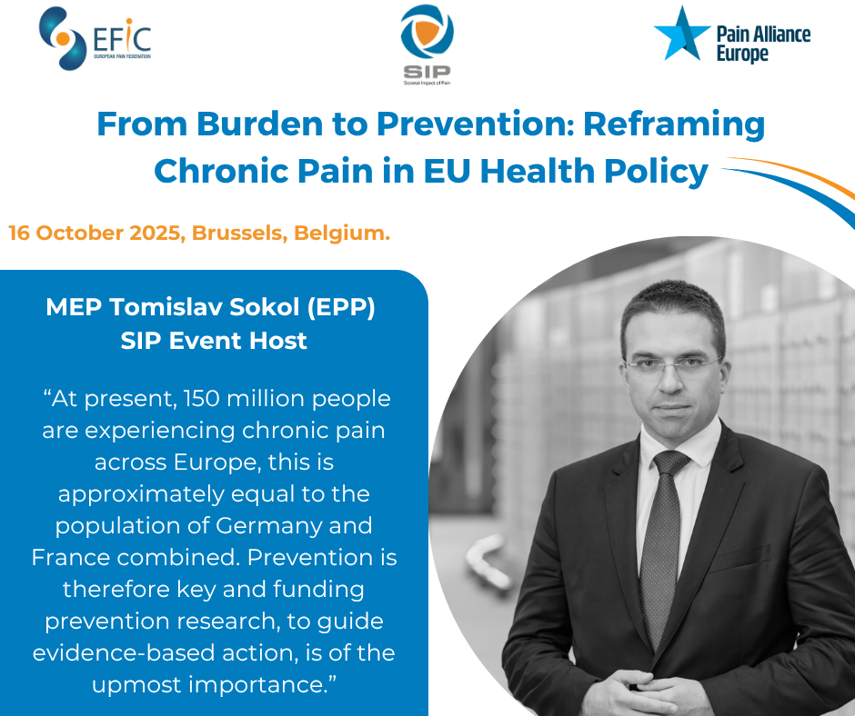 Brussels, 16 October 2025 – The Societal Impact of Pain (SIP) platform today hosted “From Burden to Prevention: Reframing Chronic Pain in EU Health Policy” at the European Parliament (Room A3E-2), bringing together EU policymakers, researchers, clinicians, patient advocates, representatives from leading European health organisations, including the European Cancer Organisation (ECO) and the Europe Region World Physiotherapy (ERWCPT), the World Health Organization (WHO), as well as speakers from the World Rehabiliation Alliance (WRA/WHO). The event explored how Europe can scale up prevention for one of its most prevalent and costly health challenges.